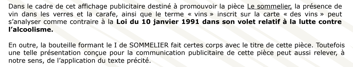 Quand la loi Évin s’invite au restau, d’aucun dirait que ça plombe un peu l’ambiance… Quelle ne fut pas la surprise de l’équipe de production du Sommelier, fière et fébrile de fouler les planches du théâtre du Gymnase à partir du 28 mars prochain, d’être suspendue, à 15 jours de l’affichage, à une sentence des services juridiques de JC Decaux et Médiatransports. Pourtant, avec plus de 90 dates de tournée, l’affiche d’origine a été multi-diffusée sans modération. Est-ce à dire qu’on boit plus en Province qu’à Paris ? Foin d’idées reçues ! Vu le nombre de tables z’et bistrots que compte la capitale au kilomètre carré… Plus sérieusement, les affiches de théâtre ont tendance à passer entre les gouttes tant qu’elles ne passent pas par des régies censées respecter une loi qu’elles n’ignorent pas.