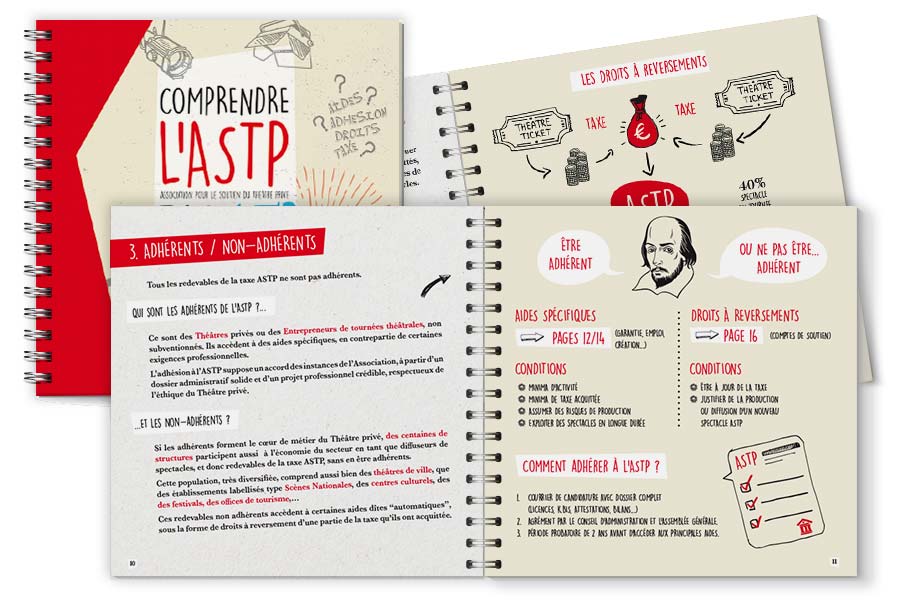À la demande et en étroite collaboration avec l’Association pour le Soutien du Théâtre Privé (ASTP), fruit de plusieurs mois de travail et de réflexion, l’agence a réalisé une plaquette illustrée intitulée « Comprendre l’ASTP en 15’ chrono ».